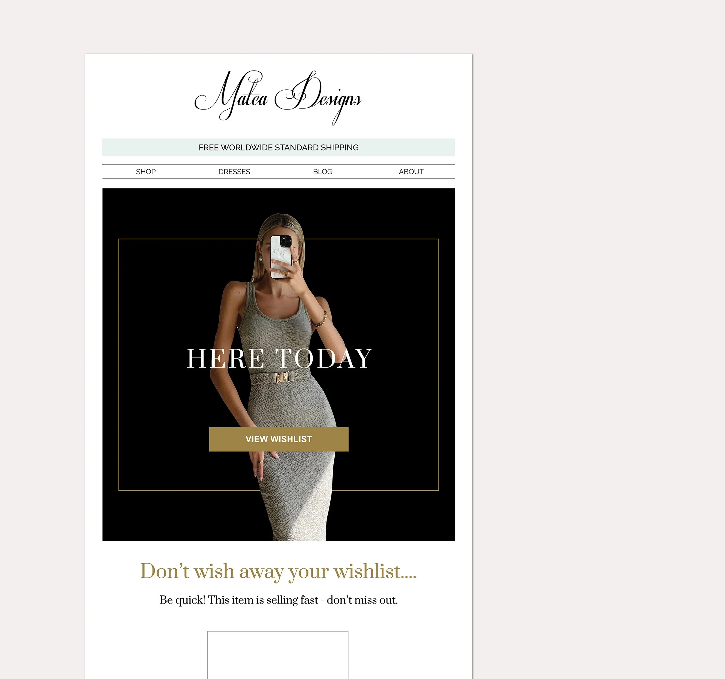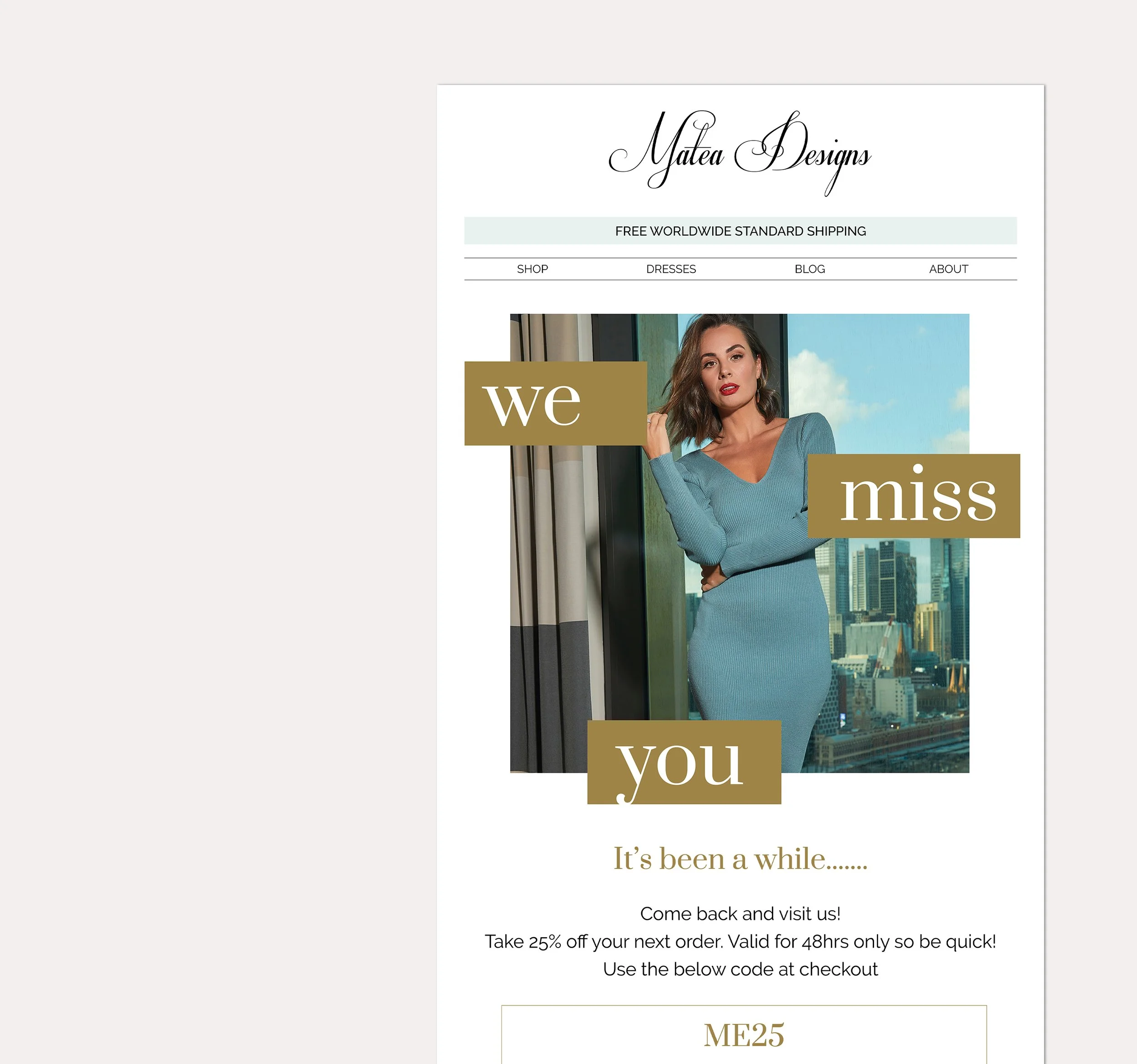 For Matea Designs, a boutique Australian fashion brand specializing in unique, timeless garments, I collaborated with the business owner to enhance the customer experience through expertly crafted EDM designs & automations. By setting up and designing behavior-based flows, I ensured that each communication resonated with the brand's ethos and maximized engagement. This project focused on delivering impactful, tailored messaging that reflected the exclusivity and quality of Matea Designs' collections and also drove revenue results.
